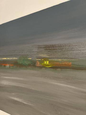 This painting resembles a distant land where forgotten memories lie hidden in shades of gray and shadows. Each patch of color tells a story—red symbolizes lost passion, green whispers of life within the silence, and the expansive gray serves as a reflection of an unknown past.