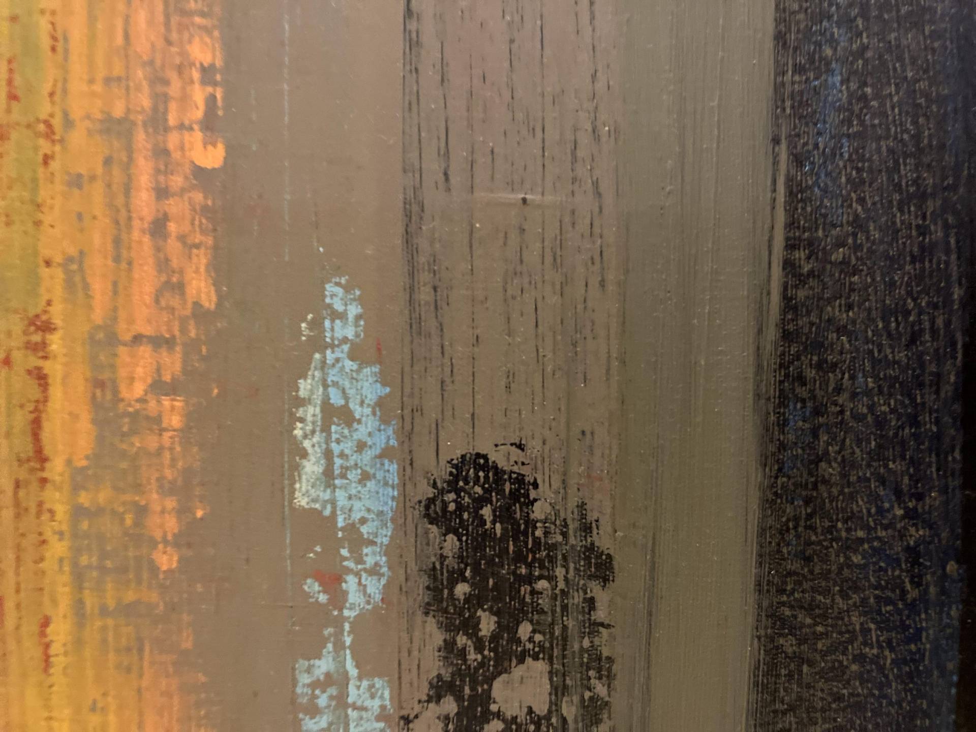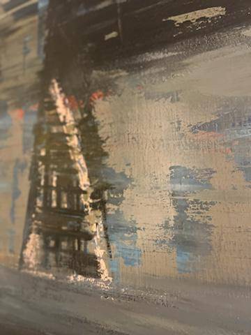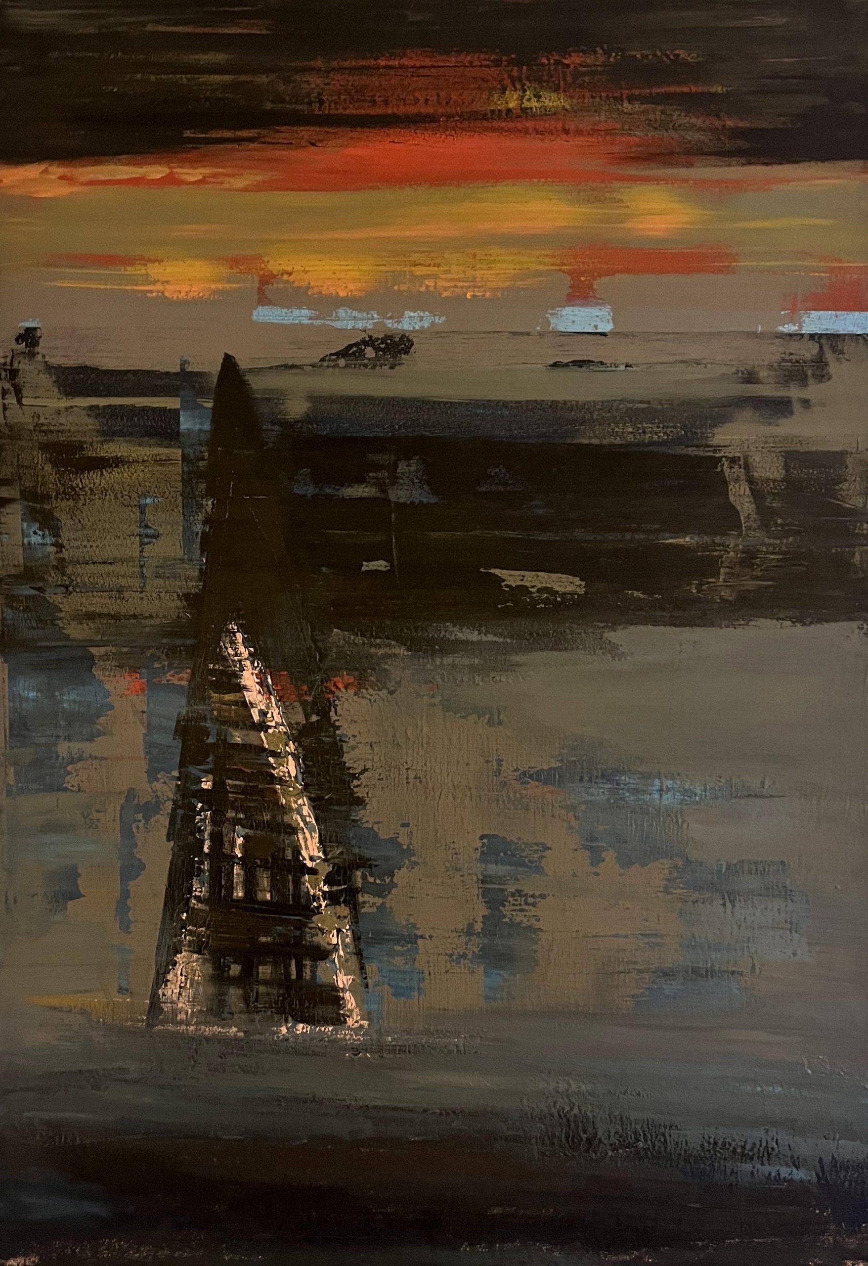 In “Voyage Through the Mist,” the Abstract Expressionism style is utilized with dense textures and free brushstrokes, presenting a blend of darkness and light. The boat, though vague and blurred, serves as a symbol of humanity’s journey through obstacles and uncertainties. The fiery tones of the sky create a striking contrast with the dark surroundings, enhancing the sense of movement and purpose.