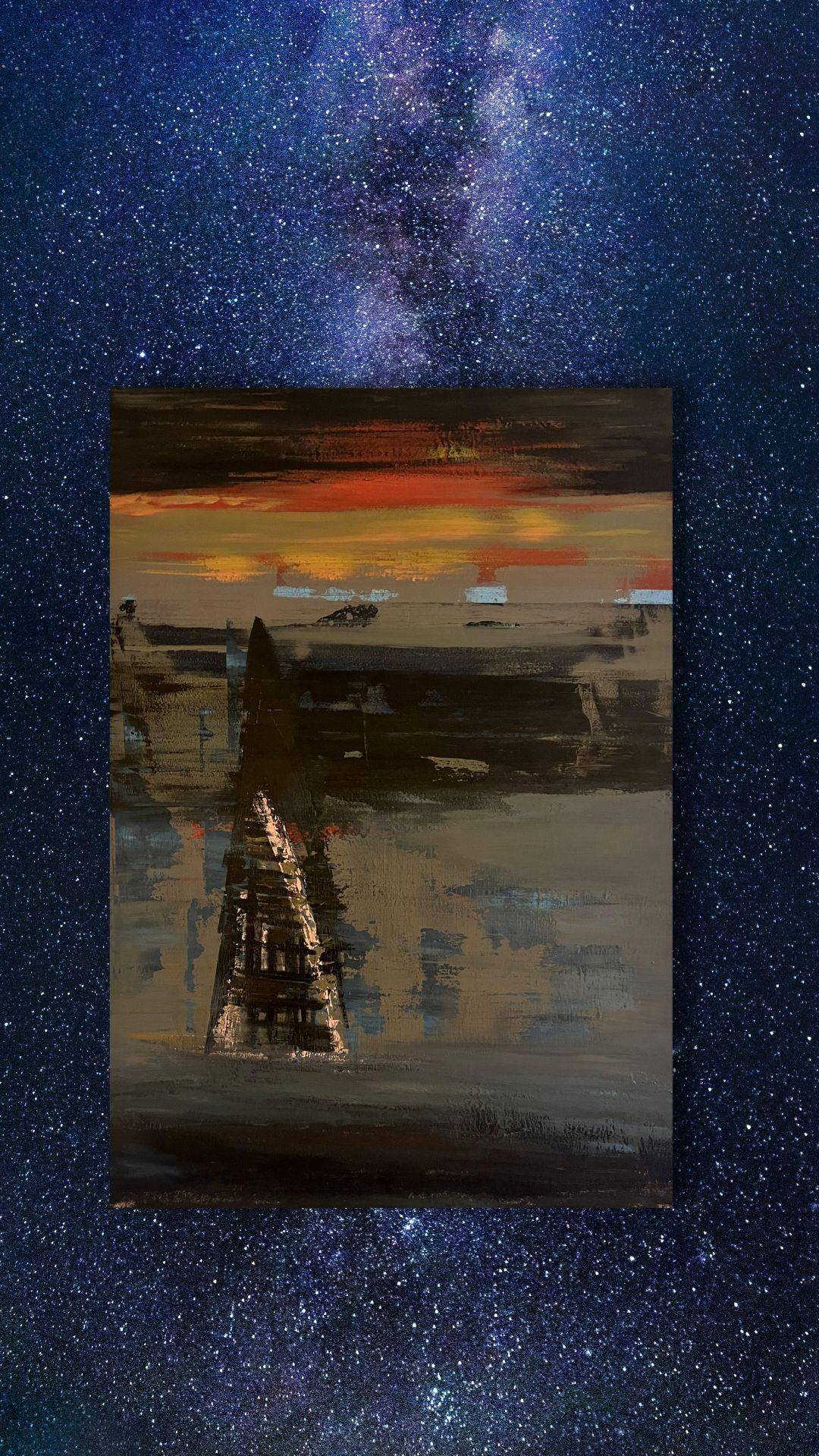 “Voyage Through the Mist” tells the story of a mysterious journey. A lone boat, barely visible, moves across a dark sea under a warm, glowing sky. The mist that envelops the scene symbolizes the obstacles, uncertainties, and unknowns faced in life’s path. Yet, the fiery light of the sky above represents hope and purpose, driving the boat forward. This piece reminds us that even amidst darkness and uncertainty, the voyage toward the light persists.